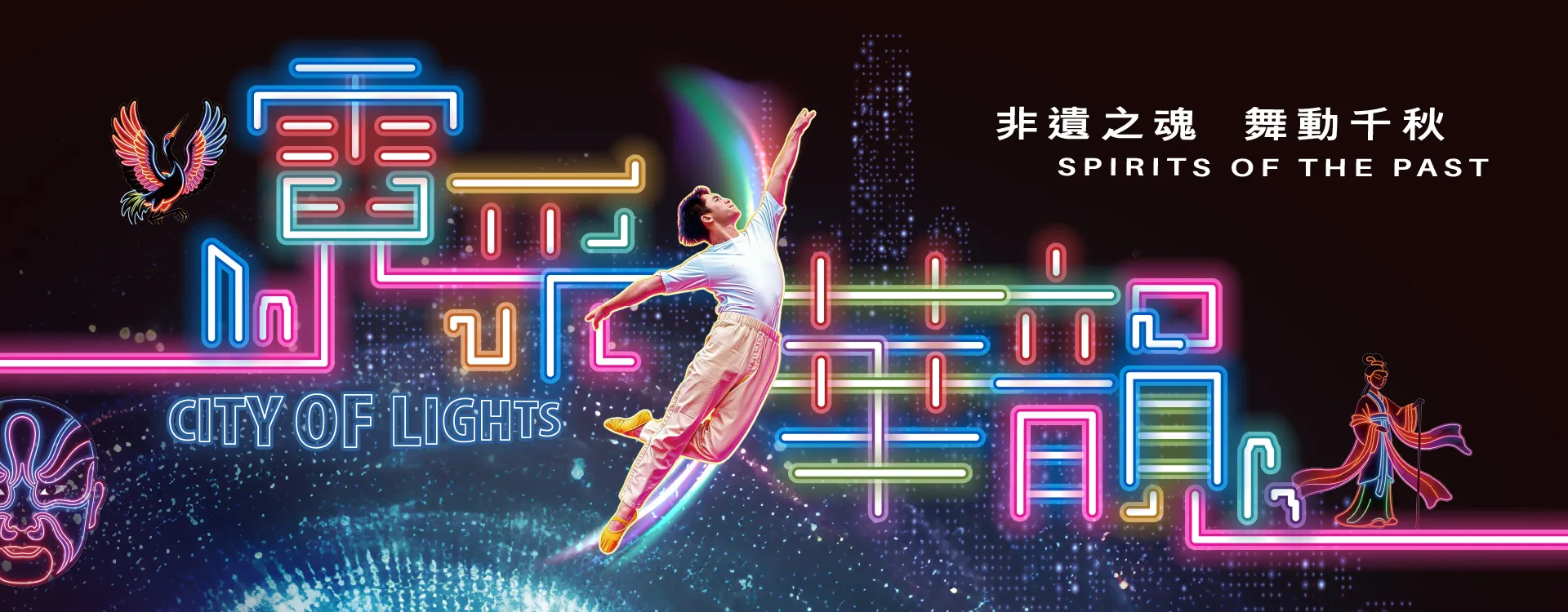 Loke, a Hong Kong neon light designer, is determined to revitalise forgotten old signboards in the city to conjure up Hong Kong’s collective memory. In search of the meaning of ‘light’, he goes through the labyrinth of light and shadows, using the map left behind by his master. On his way, he meets a narrator of traditional marionette theatre who talks about philosophy, and witnesses a passionate encounter between the face-changing stunt of Sichuan Opera and street dance. He faintly hears the electrifying sounds of the drums of the Miao tribe, and encounters Chinese paper-cut that traces a magnificent landscape… These remnants from a thousand years ago take on magical colours under the neon lights. Tradition and innovation fuse seamlessly to create new dimensions and new warmth by young dancers. This journey to trace one’s ancestry demonstrates how the transformation of technology and art can ensure the sustained vitality of Chinese culture.